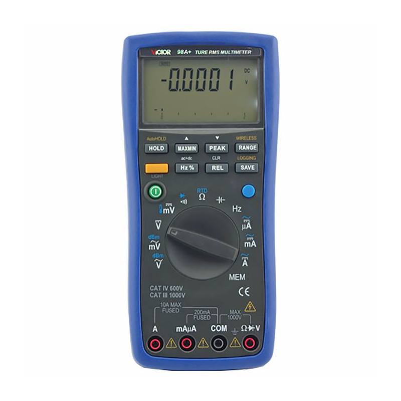 Цифровой мультиметр VICTOR 98A+ является многофункциональным тестером с ручным выбором с помощью переключателя режимов работы и пределов измерений. Аппарат имеет 4-е входных гнезда колонкового типа на передней панели (утеплены в корпус) и представляет собой надежный портативный цифровой прибор с батарейным питанием. Аналого-цифровой преобразователь с двойным интегрированием делает этот мультиметр точным и надежным инструментом.