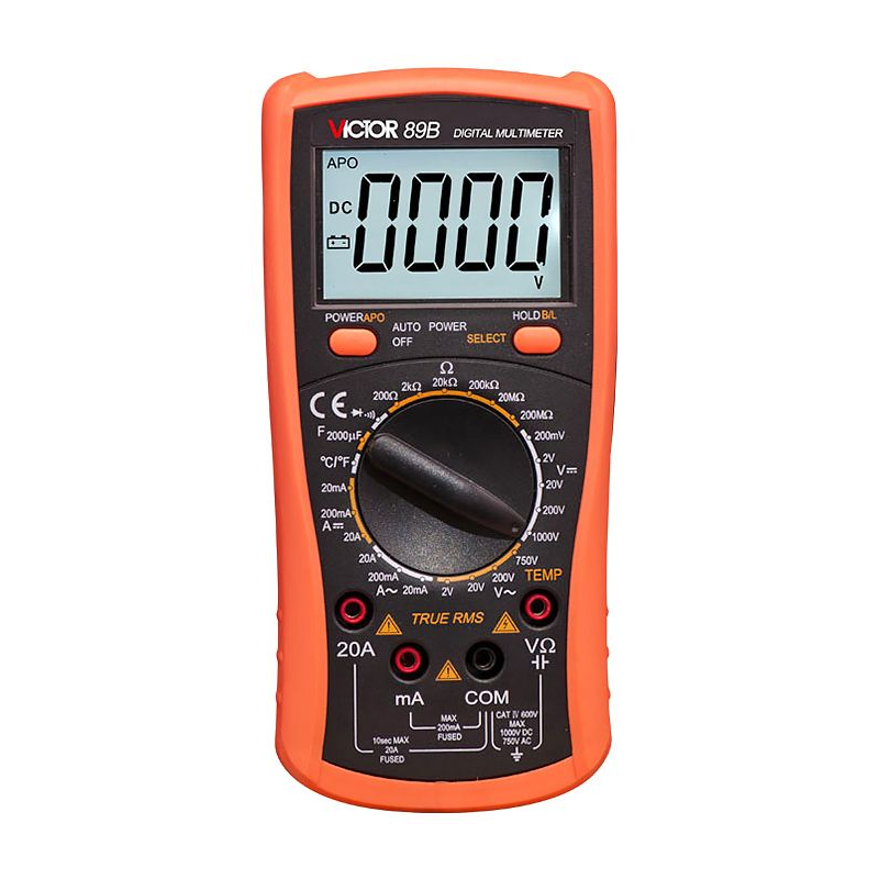 Цифровой мультиметр VICTOR 89B - многофункциональный измеритель с ручным выбором режимов измерений и модернизированным дизайном. Прибор измеряет постоянное или переменное напряжение, постоянный и переменный ток, сопротивление, емкость, температуру, проверяет диоды и прозвонку цепи.