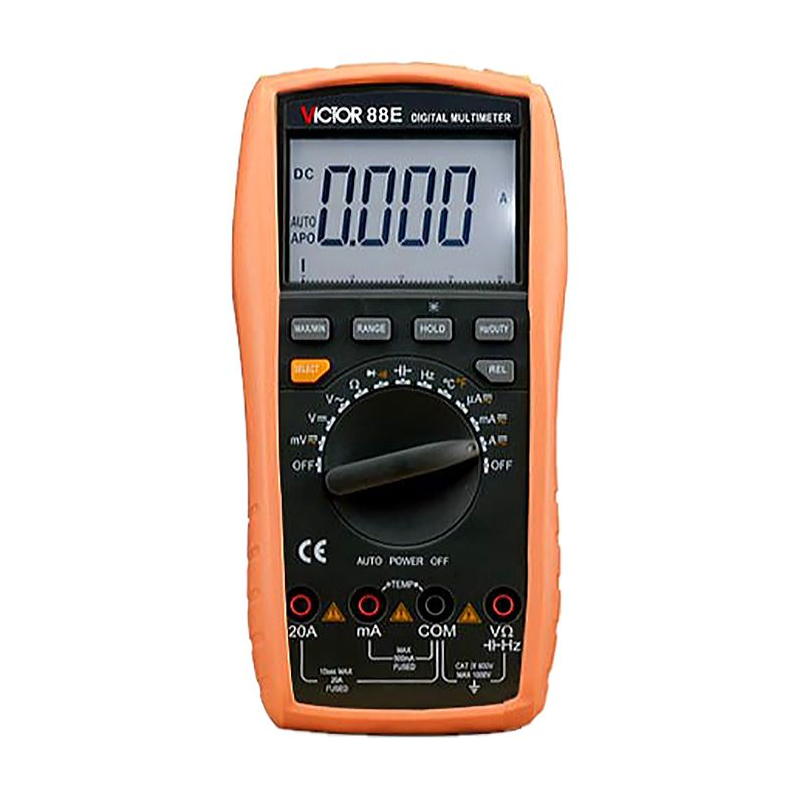 Цифровой мультиметр VICTOR 88E - многофункциональный цифровой портативный мультиметр с широким диапазоном измеряемых величин. Имеет автоматический выбор пределов, функцию мин/макс, подсветку экрана, запоминание данных, бар граф - графическую шкалу, режим относительных измерений REL, индикатор разряда батареи, авто выключение.