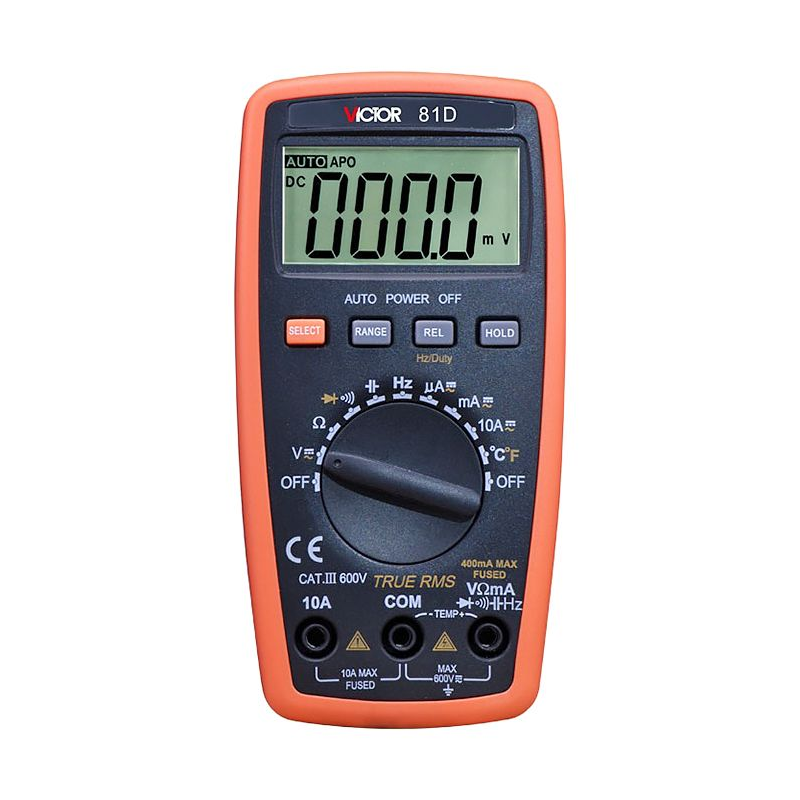 Цифровой мультиметр VICTOR 81D является многофункциональным прибором с ручным выбором режимов измерений с помощью переключателя и входными утепленными в корпус гнездами колонкового типа. Мультиметр представляет собой надежный компактный цифровой прибор с батарейным питанием.