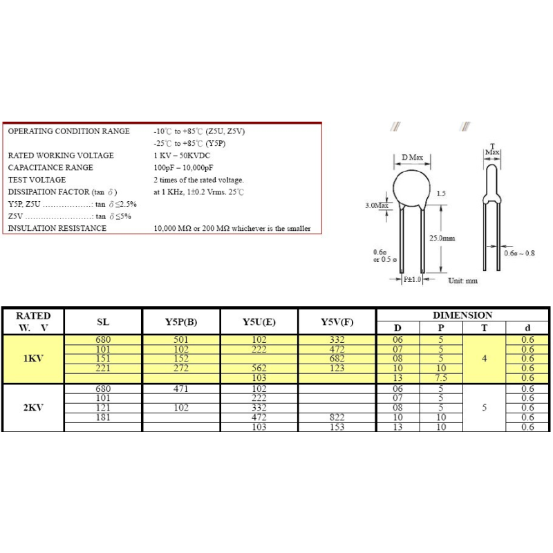 KLS10-VH16-1kV-Y5U-103-M-P7.5, 1000VDC- 0,01uf Y5U, 10nf 1000v Y5U, 0,01uf 1000v Y5U; K-Z5U 4700pF 3kV 20%